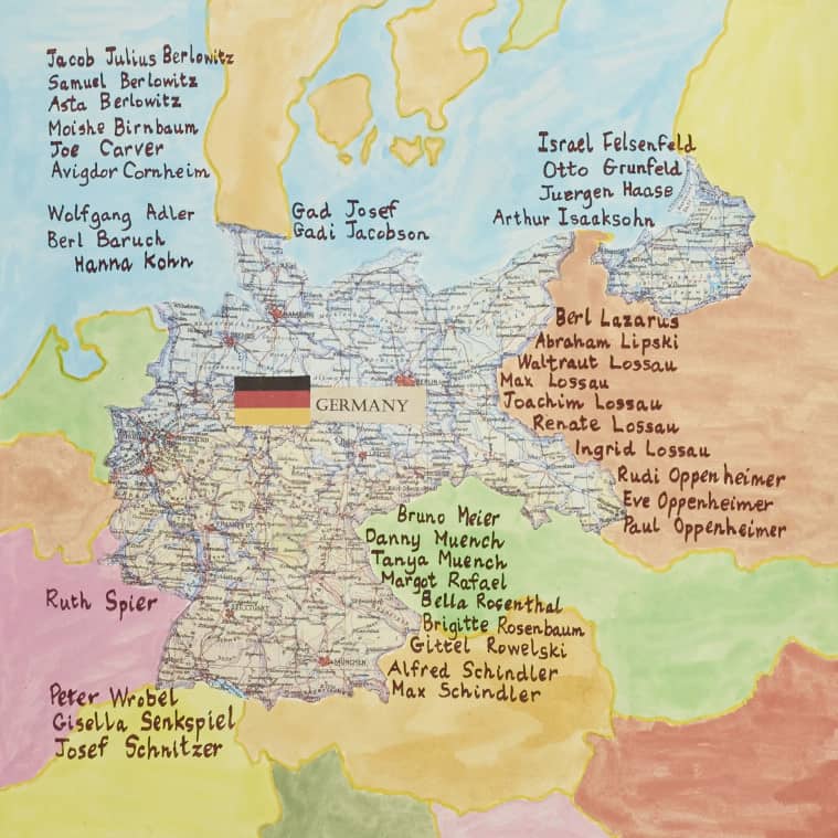 When I decided to create the shape of the country with the names, I had to plan it all meticulously to ensure every name was included. No easy task. Then came the actual writing using a broad-edged pen and 5 different paints in “earth” colours. I wanted to give each individual their due respect so changed the colour for each person as I wrote along the line. In consequence my progress was slow and on average only managed 15 names an hour! However it was well worth it to once again be able to play a small part in both commemorating and celebrating the lives of this group of holocaust survivors.