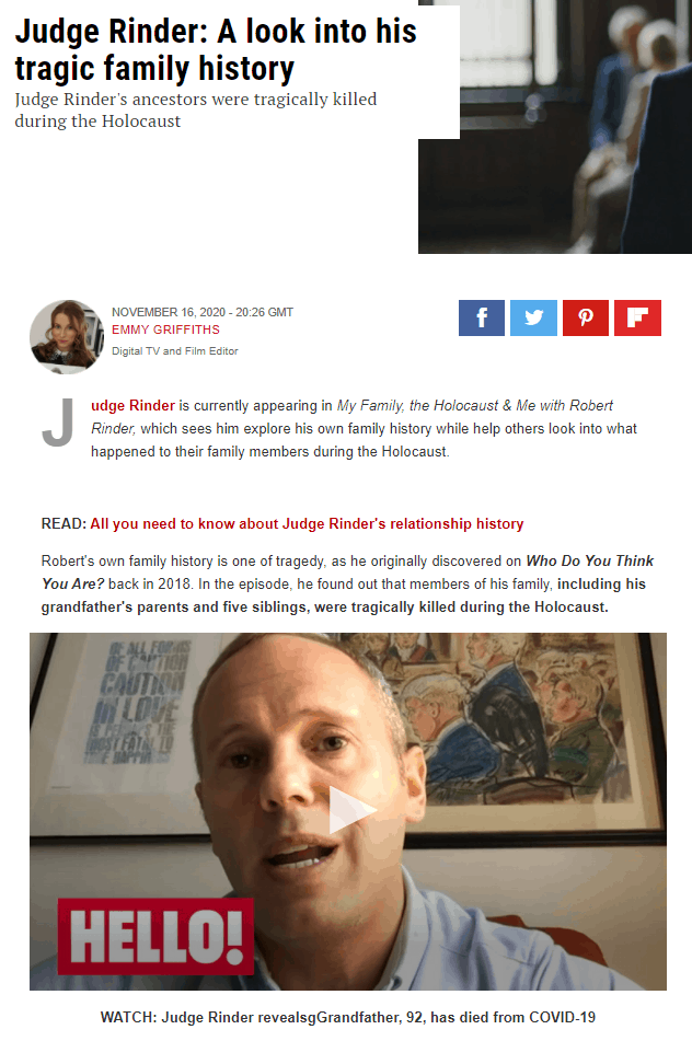 Judge Rinder is currently appearing in My Family, the Holocaust & Me with Robert Rinderwhich sees him explore his own family history while help others look into what happened to their family members during the Holocaust...