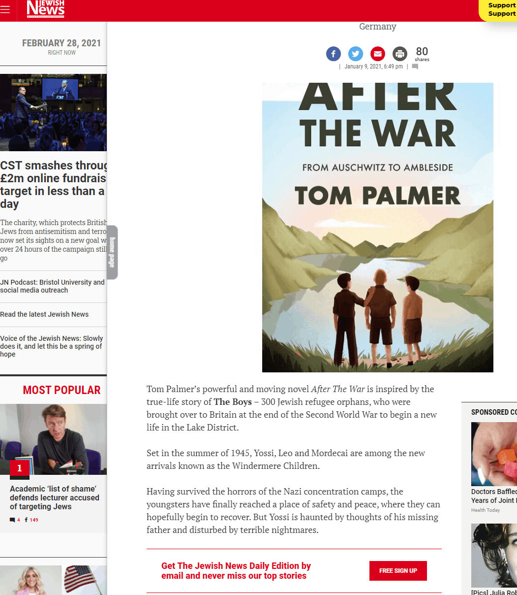 Tom Palmer’s powerful and moving novel After The War is inspired by the true-life story of The Boys – 300 Jewish refugee orphans, who were brought over to Britain at the end of the Second World War to begin a new life in the Lake District.