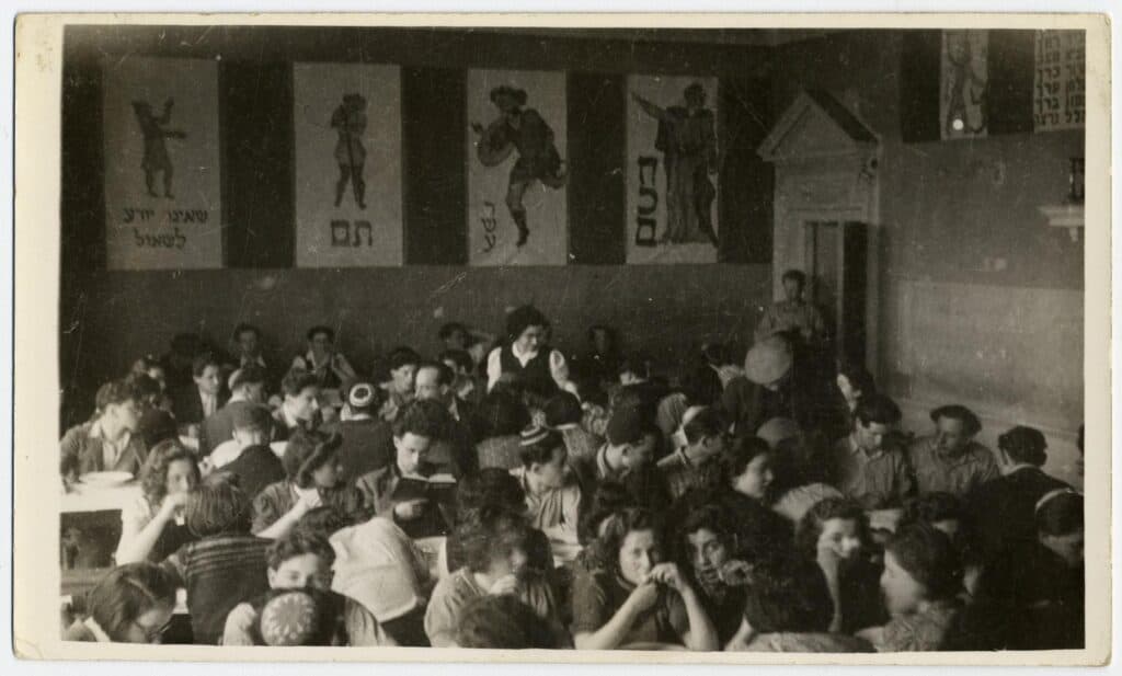 Carlebach is pictured standing at a Seder in c.1942-44 at Gwrych Castle, Wales, which was a hostel for children brought on the Kindertransports.